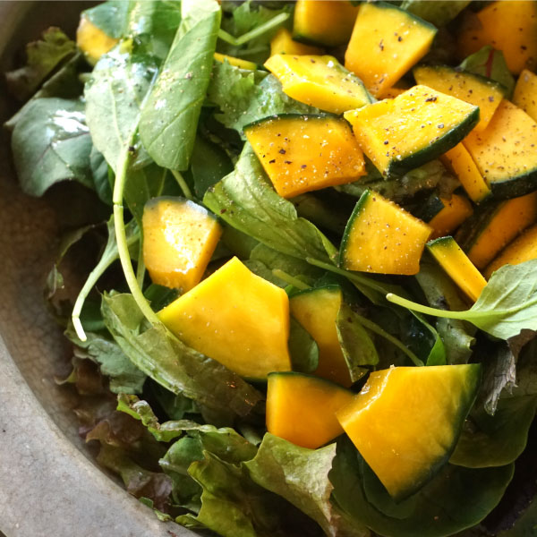 若採りのかぼちゃのコリコリとした食感を活かして、まろやかな塩味が美味しい浅漬にしています。葉野菜と合わせて食感と彩りをアクセントにした秋色サラダにするのもおすすめです。またビールやワインと一緒にポリポリつまむのにもぴったりです。